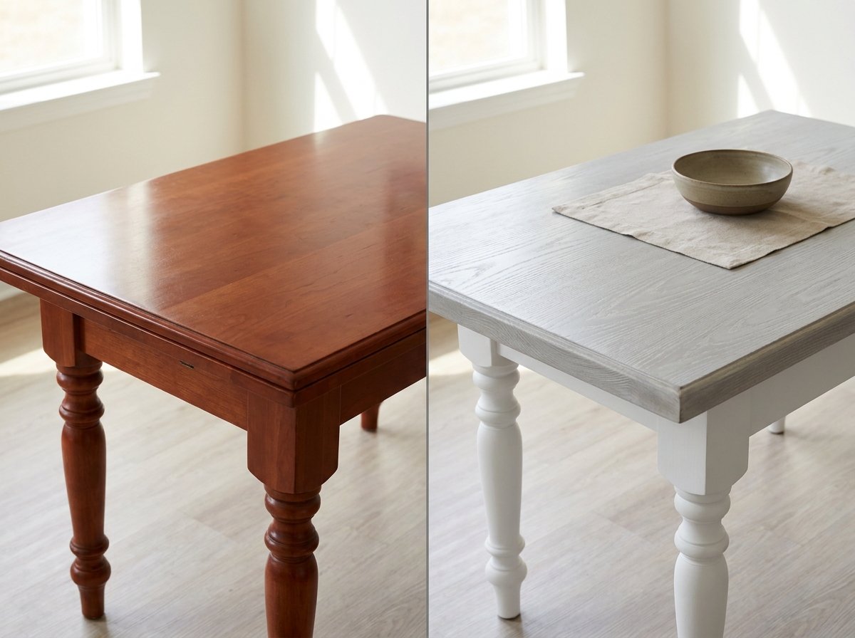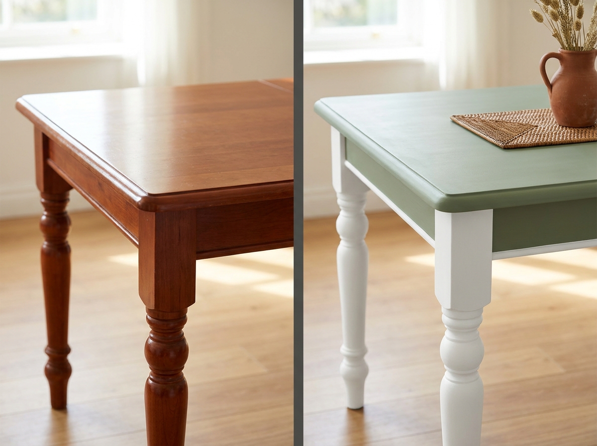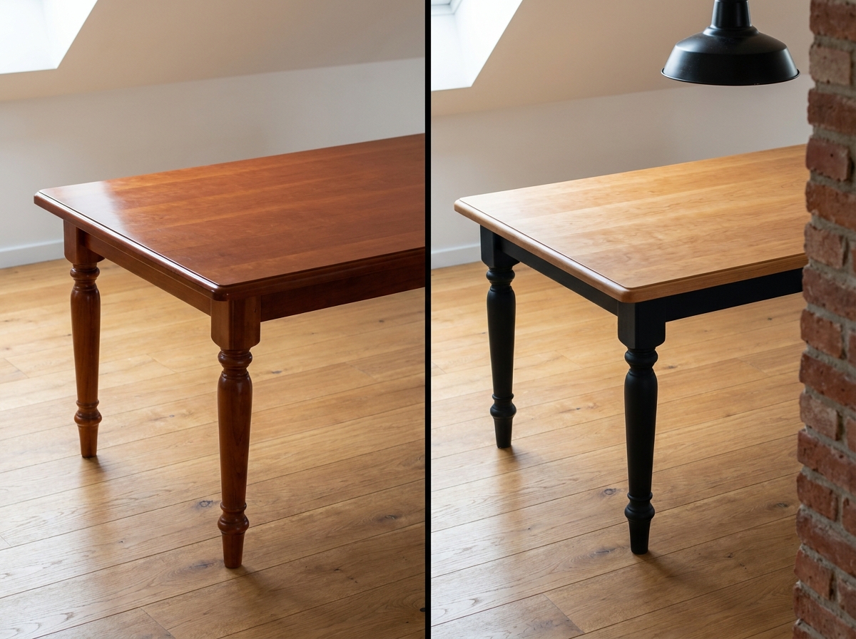 Not always. On a varnished piece in sound condition, a bonding primer skips the heavy sanding — a light 180-grit scuff is enough to knock off the gloss. Full strip is only required if the old paint is peeling or the varnish is thick and gummy. Previewing the final look in AI first spares you the unpleasant surprise of finding ugly repairs under the old finish.