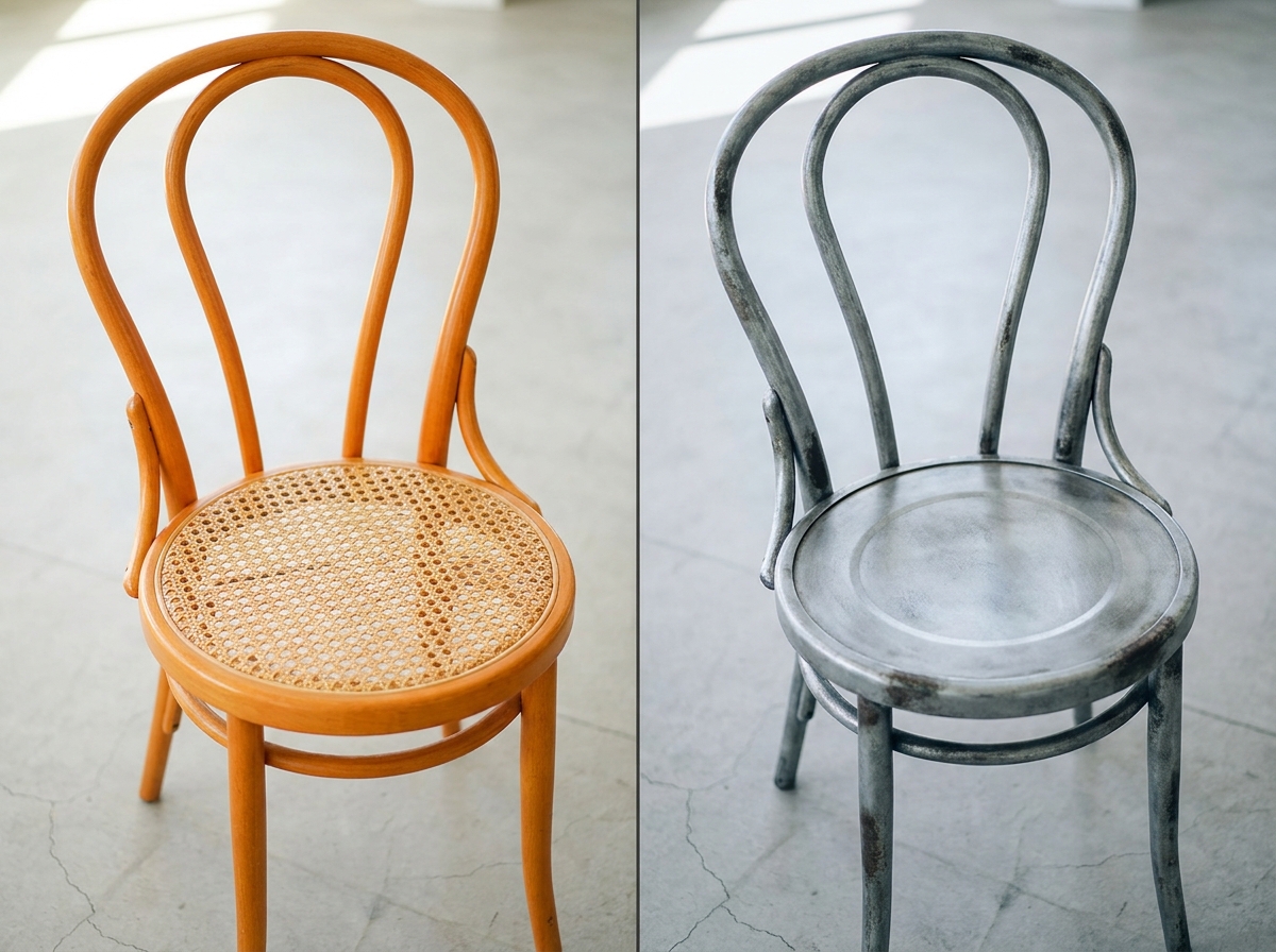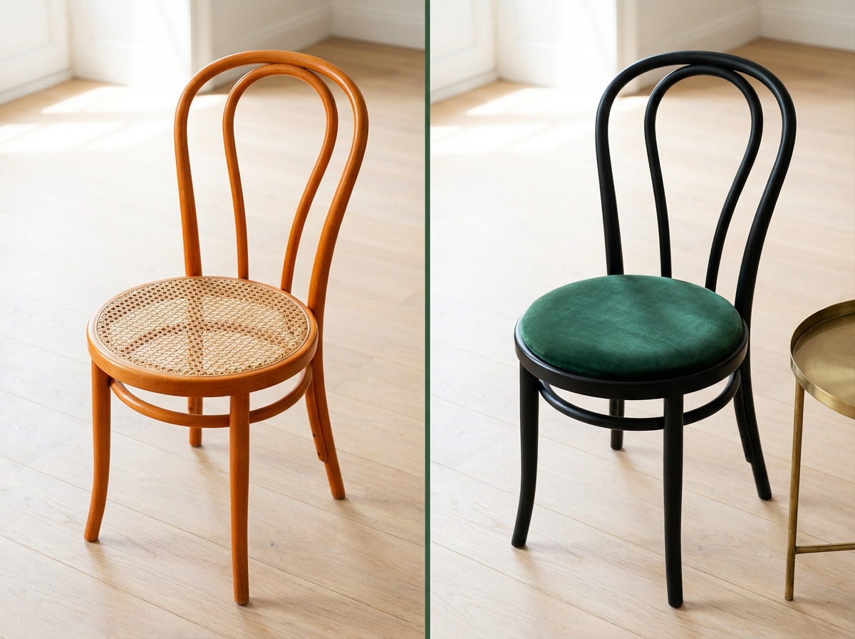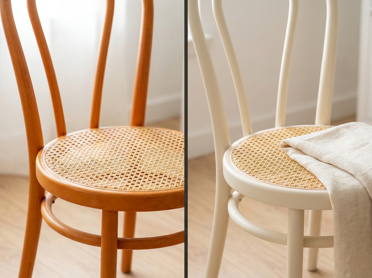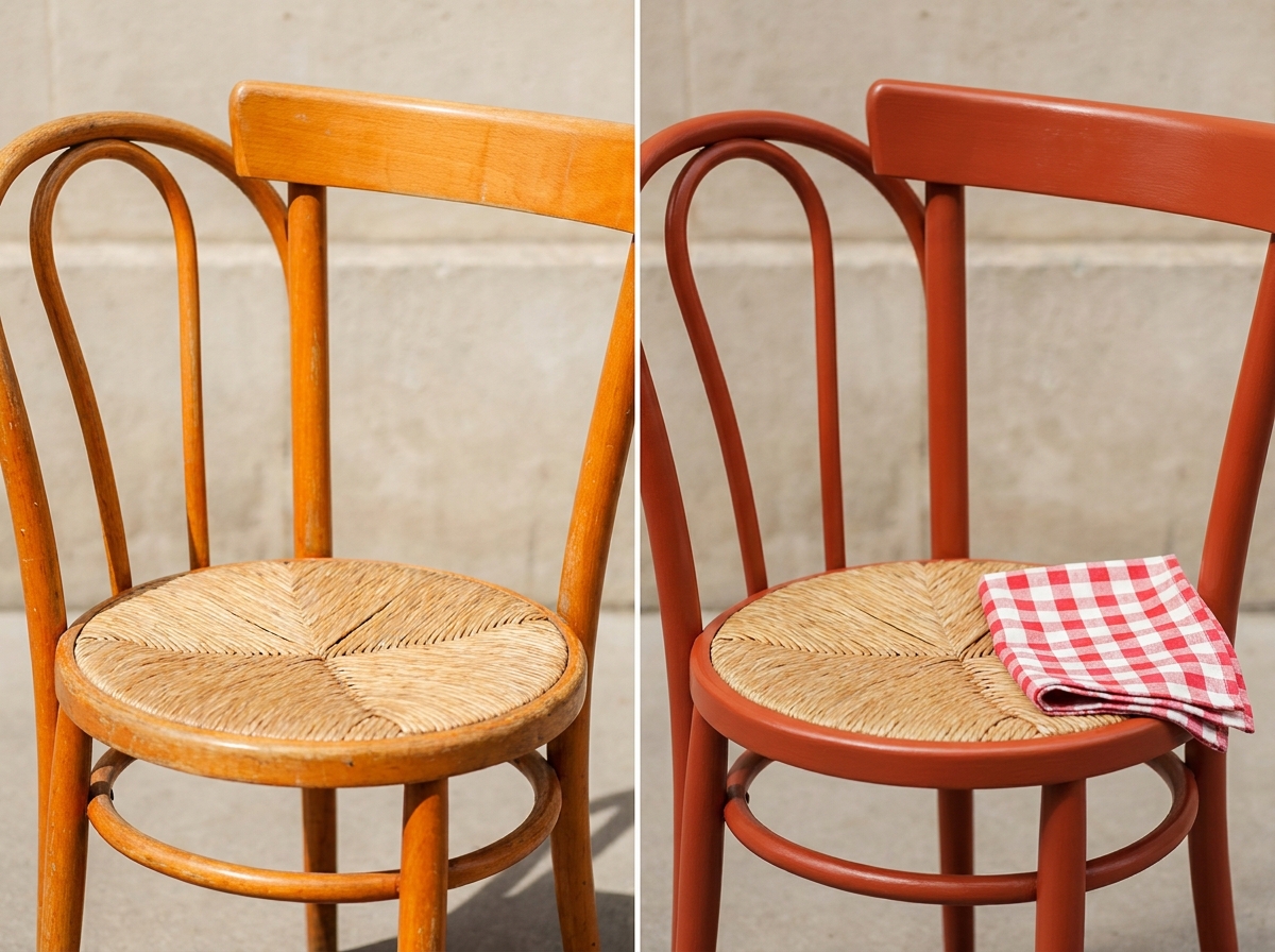 The orange-varnished beech bistro chair (Thonet-style bentwood, around $25 at flea markets and estate sales) is the easiest piece to transform. Flip one as a test run before you commit to a full set of four for the dining room.