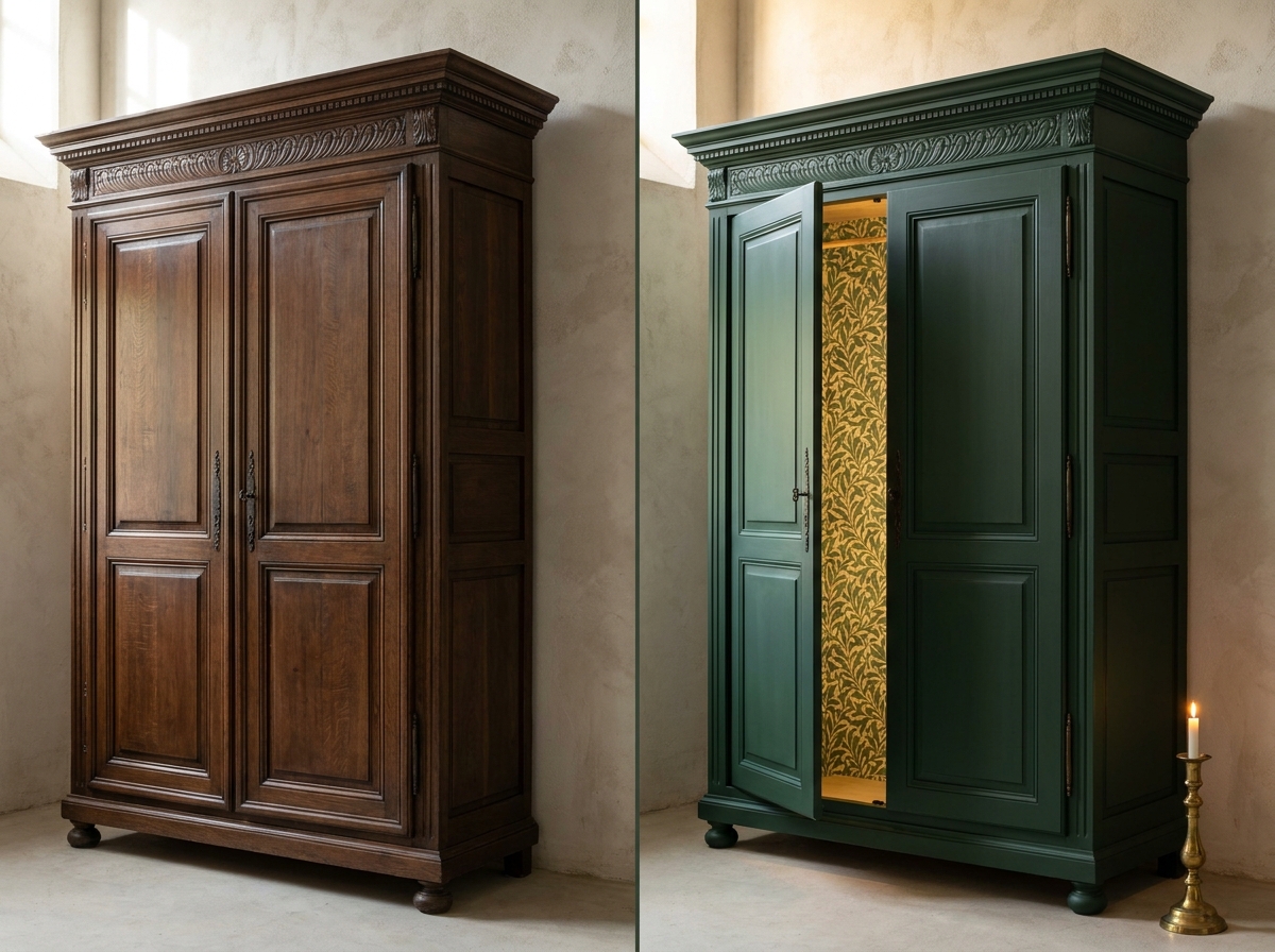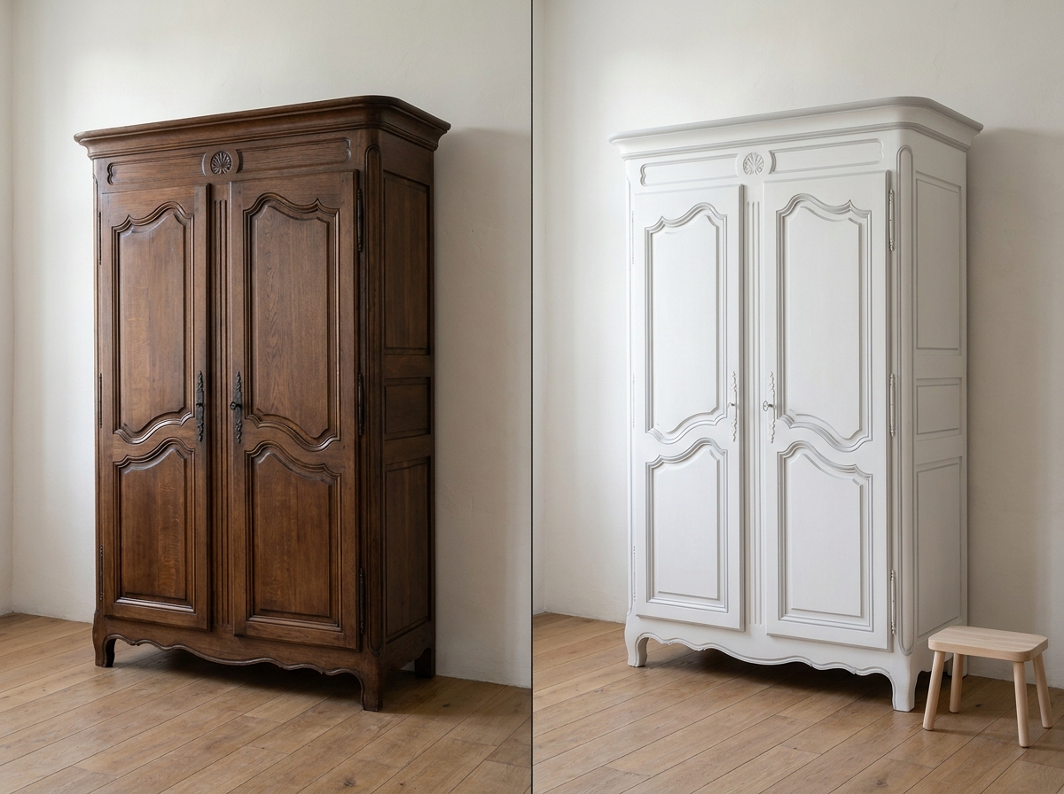 Genuine solid-oak 1930s wardrobes and chests often read better fully stripped than painted. Resale value drops by as much as 40% the moment an antique gets a coat of chalk paint. Preview in AI first — the wrong call can cost $200-$500 in lost value on a signed piece.