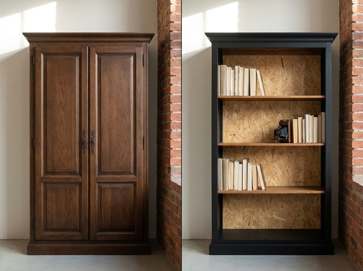 The radical option: doors removed, open shelving, OSB back, frame painted black. The armoire becomes an open bookcase. Absolutely preview this one in AI first — once the hinges come off, there is no undo.