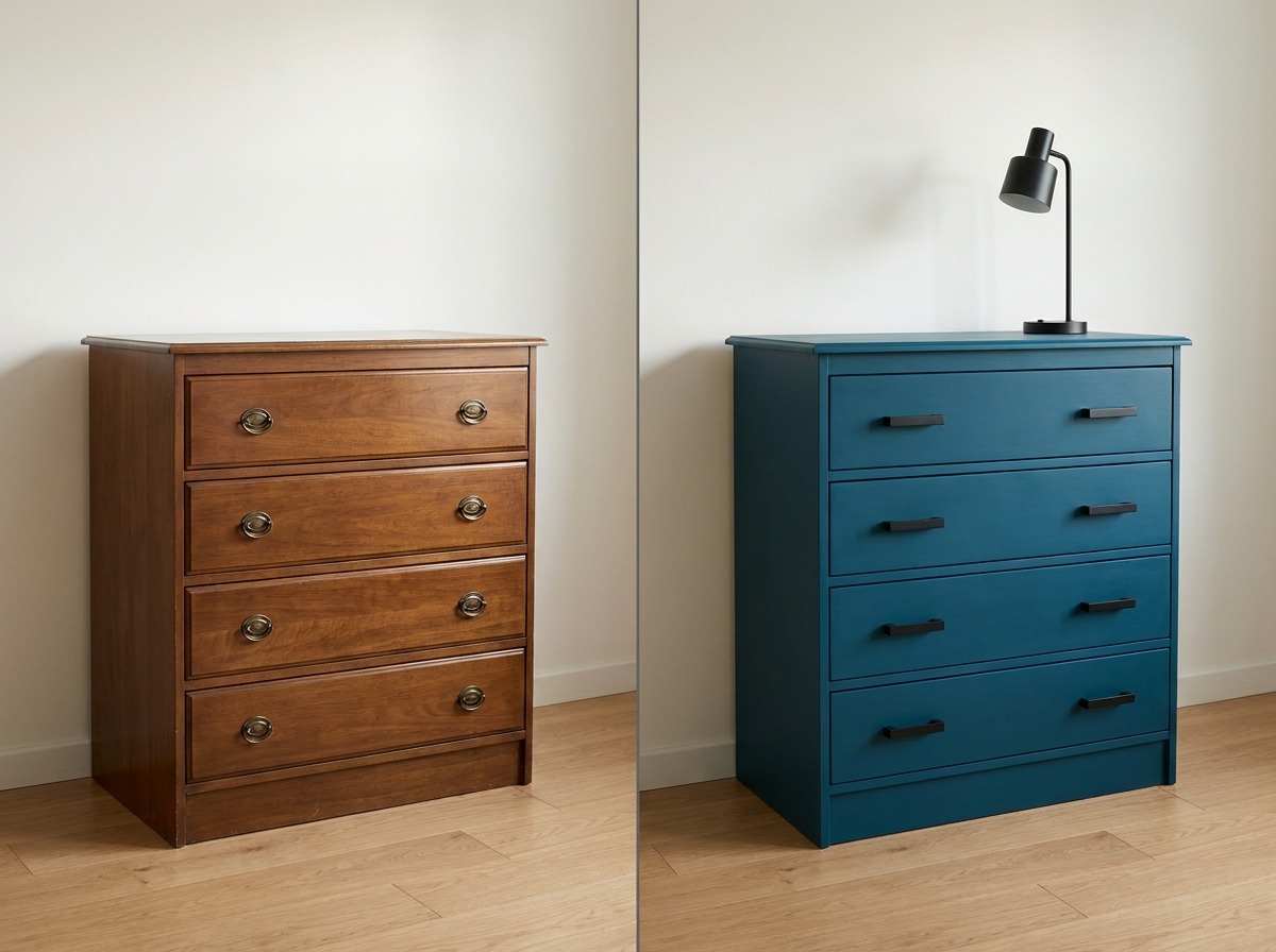 20 AI before and after furniture makeovers on 5 real pieces, 4 finishes each. Paint, wax, two-tone, new hardware. Test on your photo before you sand.