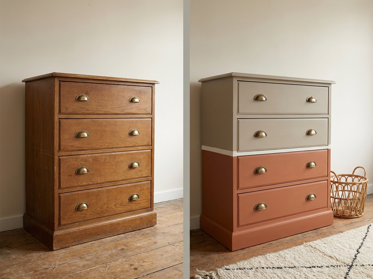The 2026 sleeper hit: greige body + terracotta on the bottom two drawers. Soft contrast, vertical read. Works with a Berber rug and a warm bohemian bedroom. Careful taping on the drawer edges is the whole game on this one — a wavy line ruins the effect.