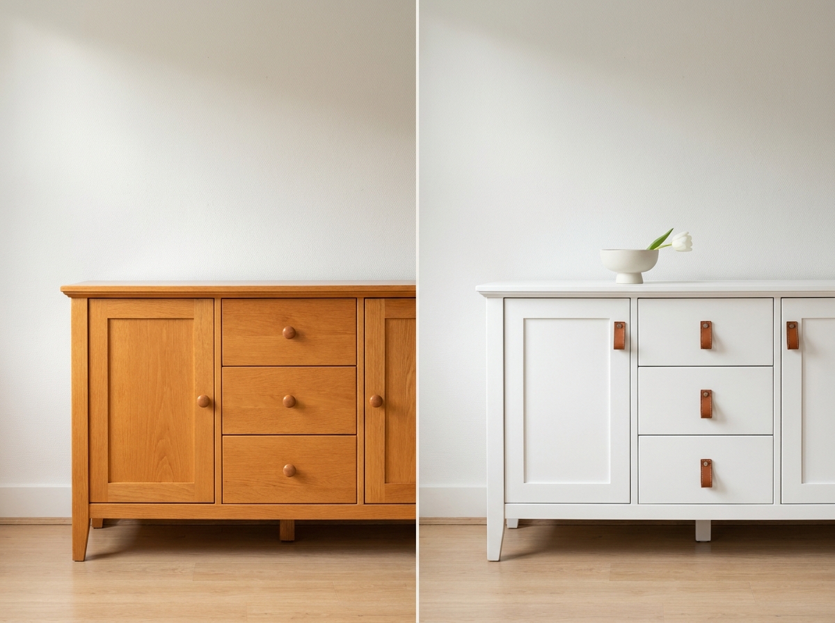 - New pulls — the single highest ROI move. Four brass or leather pulls ($30-50 for the set) change the whole read of a dresser in 15 minutes flat.