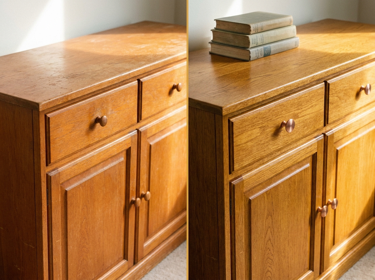 Zero paint on this one: a fine 220-grit sanding, then a wipe-on coat of clear satin reviving varnish. Swap the original pulls for brushed copper. The piece recovers its shine without losing its story — the direction to pick if the sideboard was a gift from family.