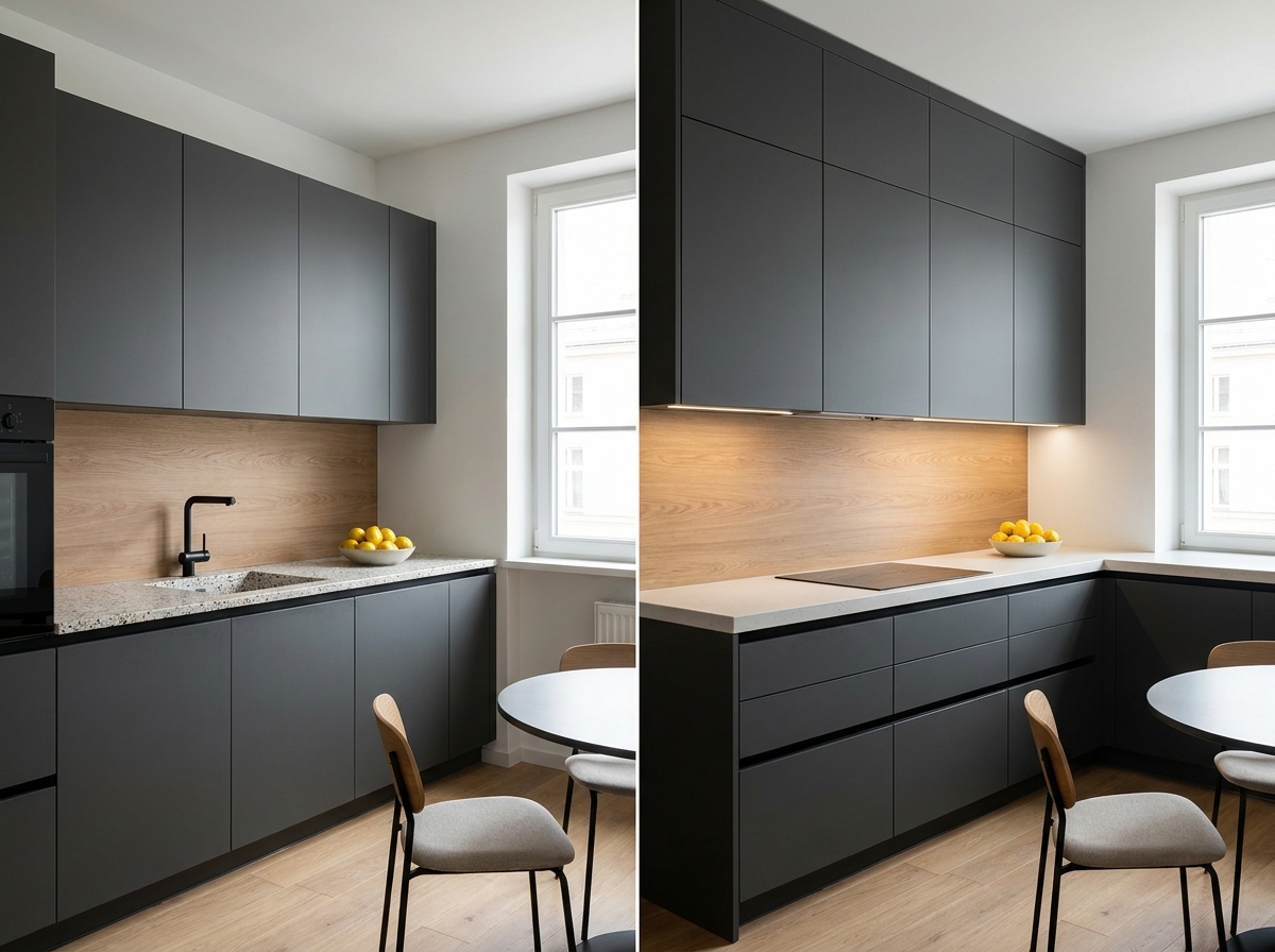Tässä tason vaikutus kääntyy raikastuksesta koetuksi uudeksi keittiöksi. Mattaviimeistelyt, ohut reunus (16–18 mm), integroidut kahvat, soft-close-saranat. Homeifyn käyttäjät tällä tasolla testaavat keskimäärin 8–12 sävyä ennen tilausta — kun kahden oven hintaero on 600 €, digitaalinen testi kannattaa enemmän kuin myymäläkäynti.